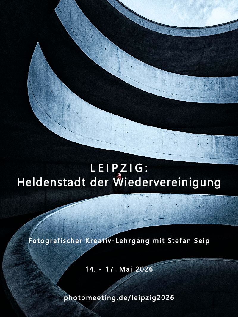 Fotografischer Kreativ-Lehrgang in LEIPZIG 12. Oktober 2025 • 16.12 Uhr Mein jährlicher »Fotografischer Kreativ-Lehrgang« hat seit 2014 Tradition. Im kommenden Jahr findet er in Leipzig statt: →www.photomeeting.de/leipzig2026 ![]() [UPDATE 18.10.2025: Die Mindestteilnehmerzahl wurde erreicht. Anmeldungen sind noch möglich.] |